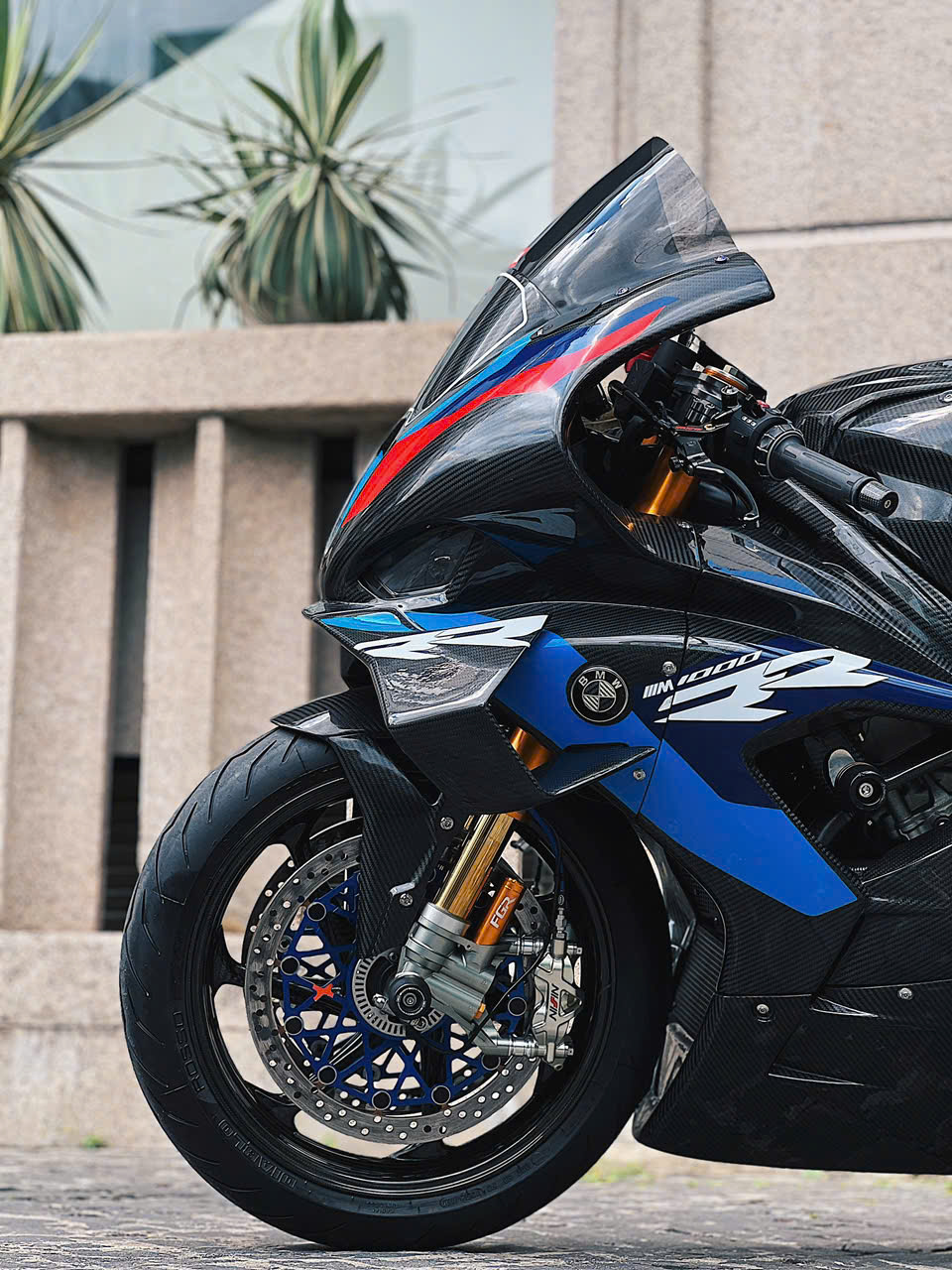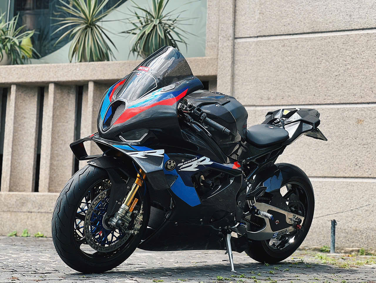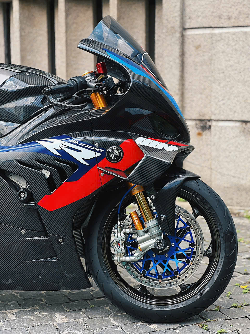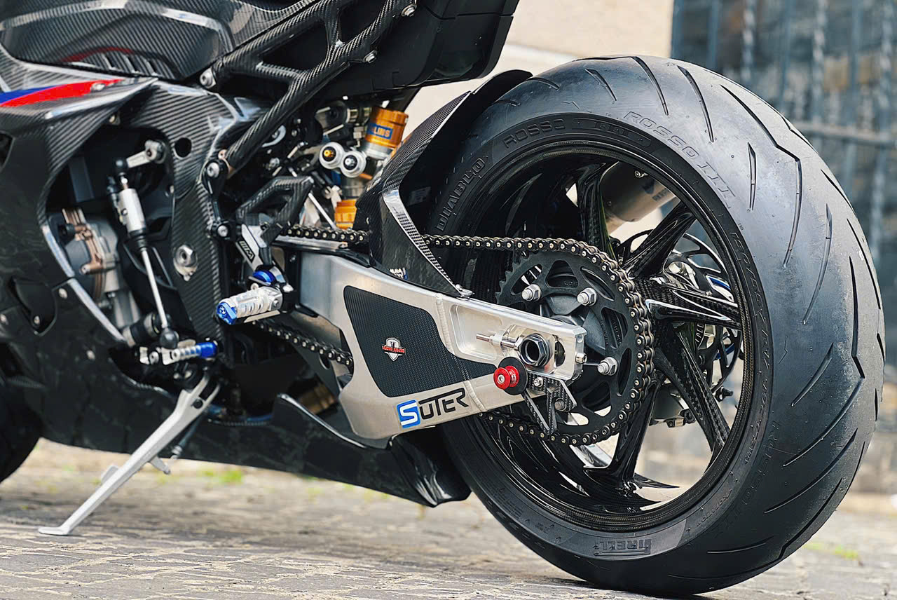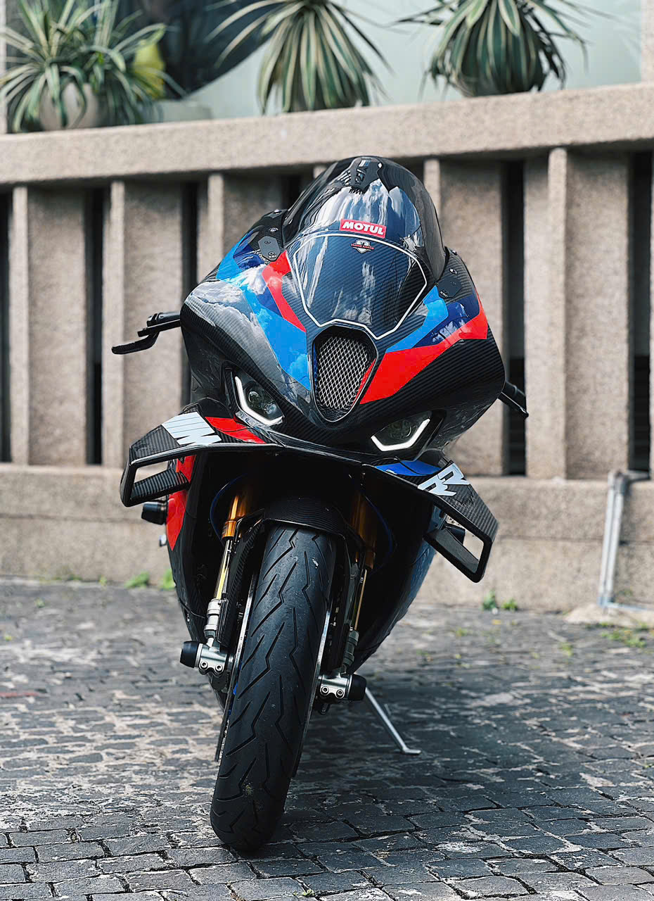 Vành bánh xe 17 inch bằng chất liệu sợi carbon trên bản độ. Trên bản M1000RR chính hãng, nhờ các trang bị bằng sợi carbon, titanium, trọng lượng xe khoảng 191 kg, giảm khoảng 2,5 kg so với bản thường.