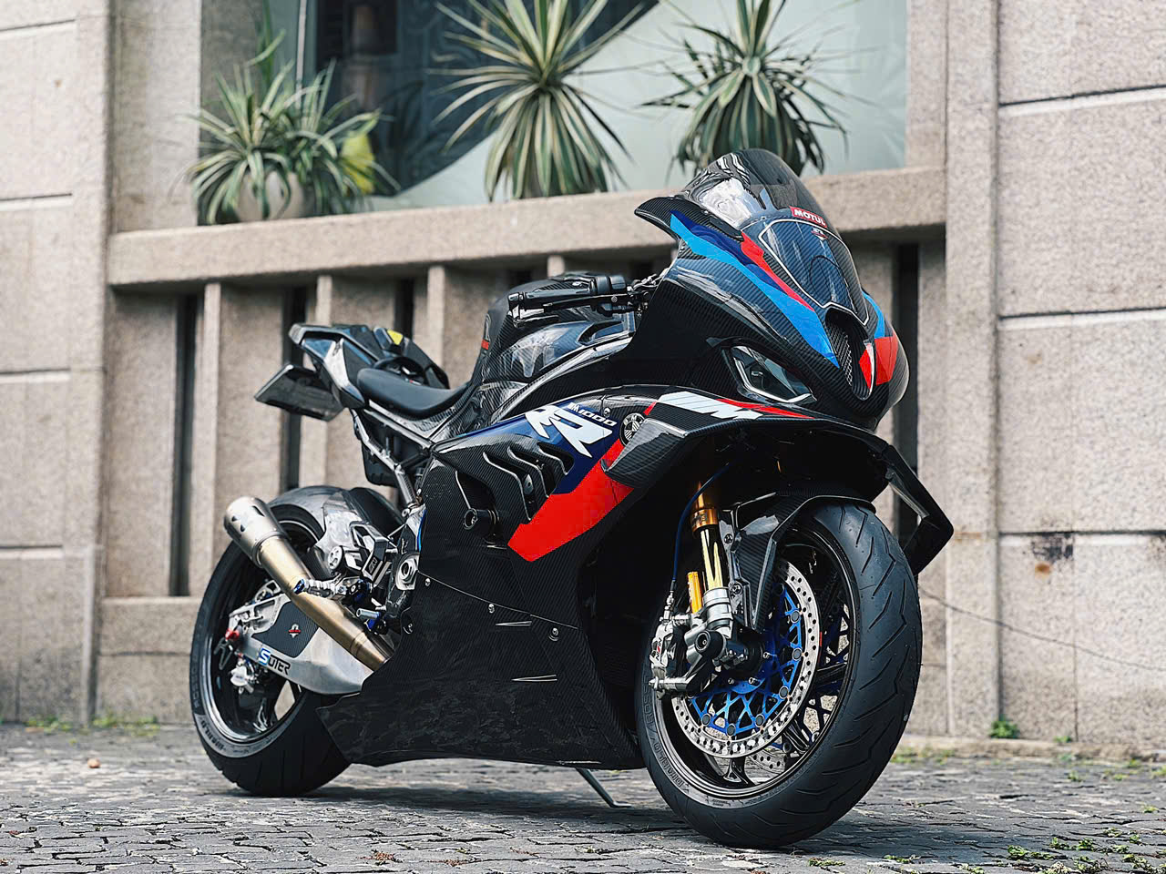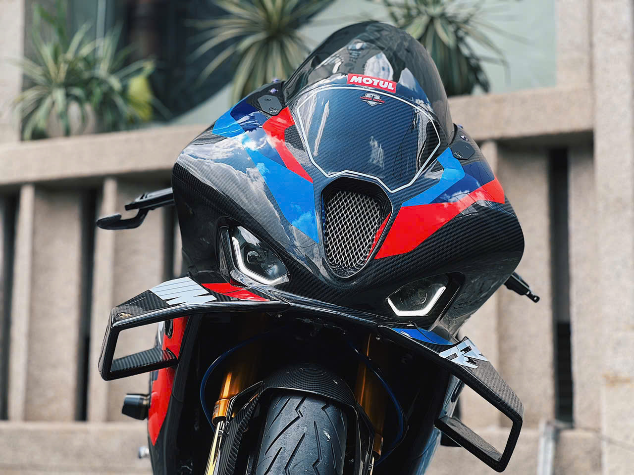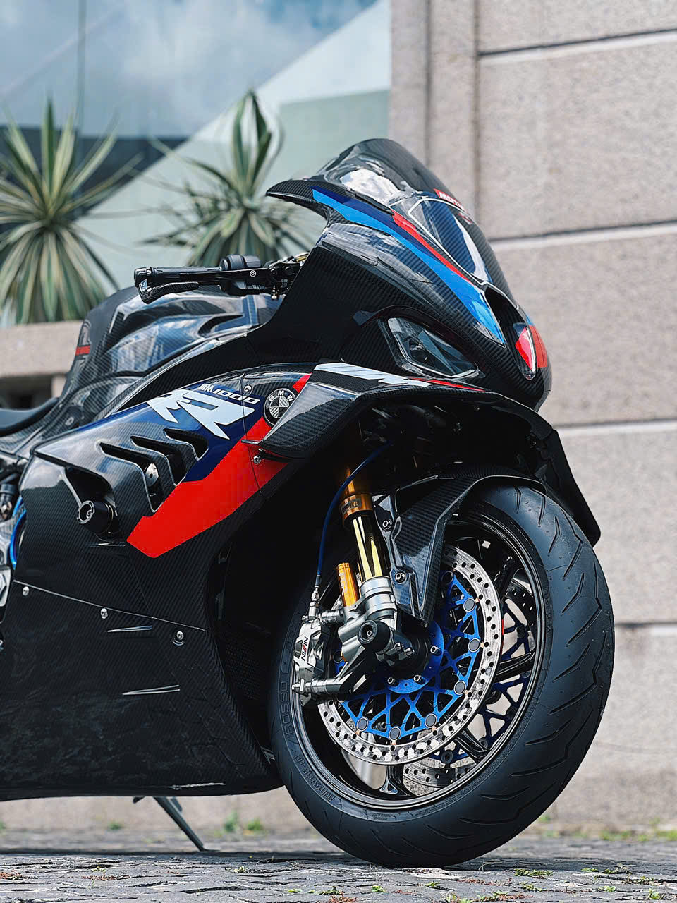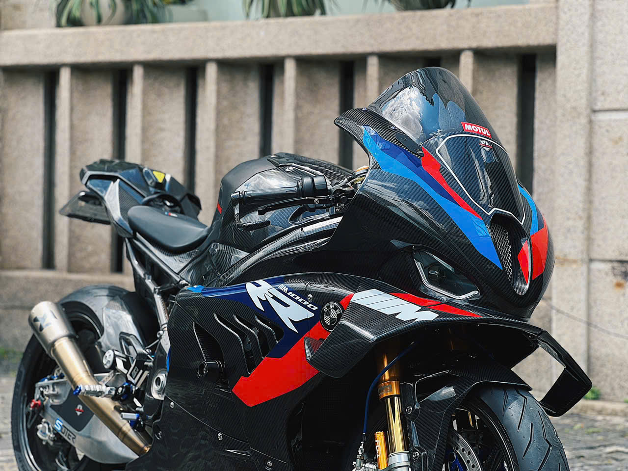 Vành bánh xe 17 inch bằng chất liệu sợi carbon trên bản độ. Trên bản M1000RR chính hãng, nhờ các trang bị bằng sợi carbon, titanium, trọng lượng xe khoảng 191 kg, giảm khoảng 2,5 kg so với bản thường.