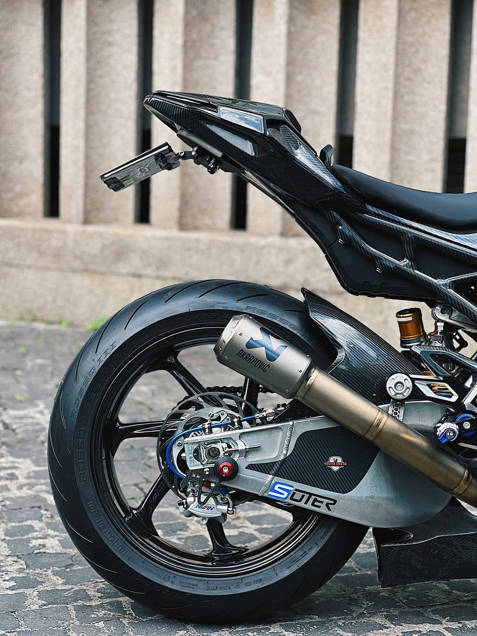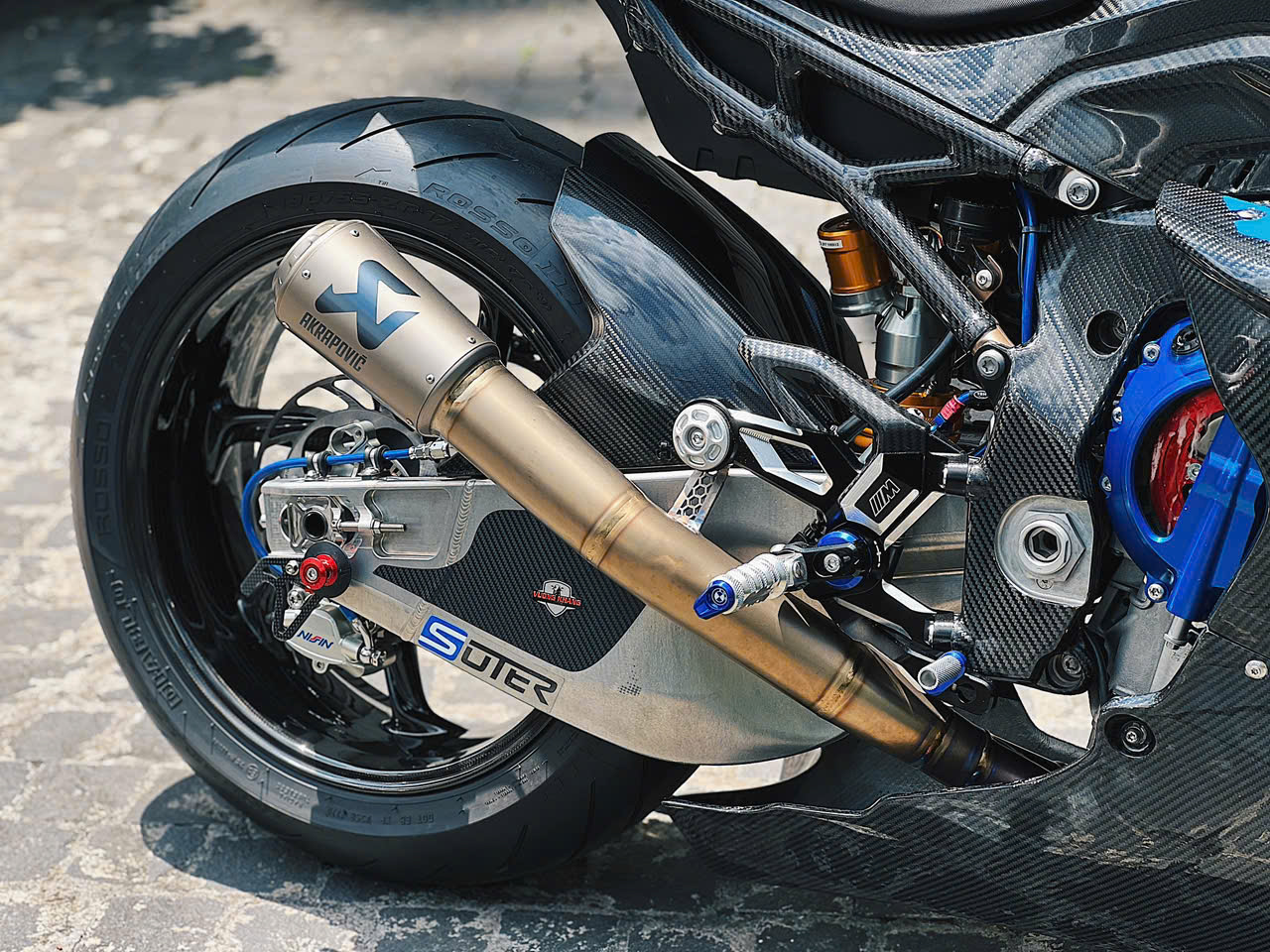 Bộ gắp sau ngược Suter được sử dụng cho mẫu xe đua WorldSBK có trên bản độ. Ống xả của dùng loại Akrapovic với chất liệu titanium. Ngoài ra, xe còn sử dụng bộ dây dầu của Hel Performance cho bánh trước và bánh sau.